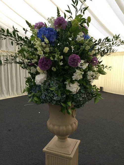 A hectic week - very busy shop, sadly two funerals but followed by flowers for a 30th birthday. Lots of strong blues and whites on the tables and a huge urn on pedestal in the marquee.